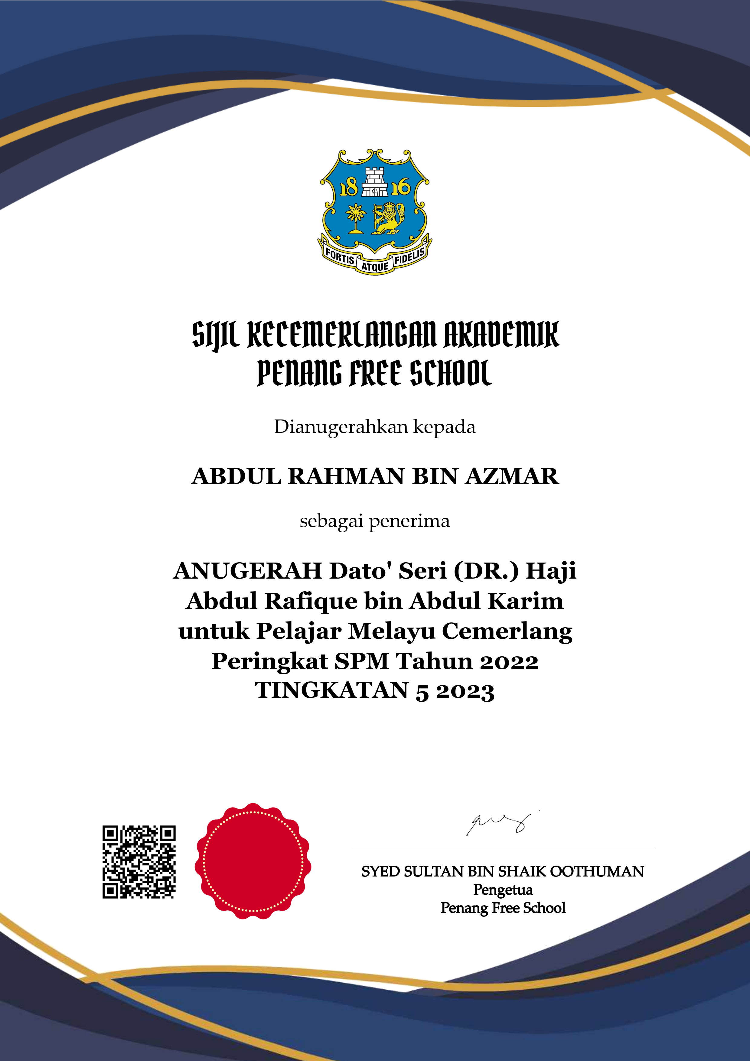 ANUGERAH Dato' Seri (DR.) Haji Abdul Rafique bin Abdul Karim untuk Pelajar Melayu Cemerlang Peringkat SPM Tahun 2022